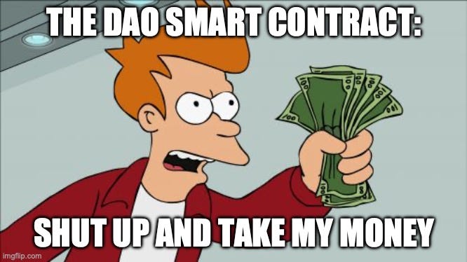 This may have already seemed like a recipe for a disaster; having all that ETH in one place was too attractive a target. To put numbers into perspective, the amount of ETH raised by The DAO was equivalent to about $160 million. At that time, this crowdfund was the biggest in history! Mainstream media was beginning to recognize the still-young Ethereum. Meanwhile, all that ETH sat in a single smart contract until disaster struck in June, the following month.